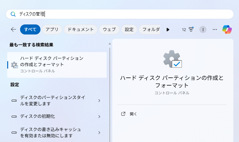 - 表示されたメニューから「ディスクの管理」を選択して起動します。