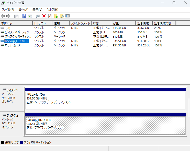 - 「ディスクの管理」画面で、外付けHDDを探します。