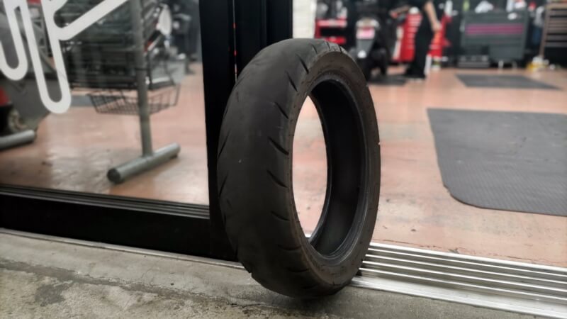 具体的には、トレッド(溝)がほぼ無くなり、表面はツルツルのスリック状態。