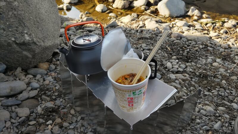 持参したソロキャン用のクッカーを展開します。川辺で啜るカップラーメン、